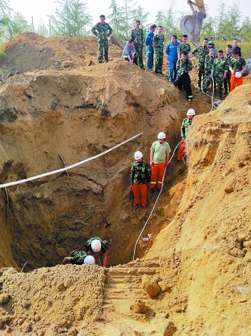 挖掘机停止工作后,几名消防战士沿着斜坡下去用铁锨一点一点往外挖土。土越挖越多,挖出的土有3米多高,已把绿化带里的树给埋住。在土堆旁还放着一个辘轳和一个筐,筐里有半筐土。急救大夫和护士严阵以待,救护车也开到了斜坡口。